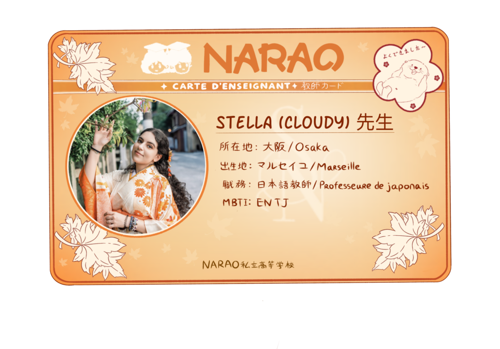 Stella a découvert le Japon à 16 ans, lors d’un échange scolaire dans un lycée près d’Osaka. Depuis, cette passion ne l’a jamais quittée ! Après un Master en langue et culture japonaise, un an d’études à l’université d’Osaka, et un autre Master en didactique de l’enseignement du FLE, elle s’est installée définitivement au Japon. Aujourd’hui, elle agit au sein de NARAO en tant que directrice mais aussi professeur de japonais, toujours disponible pour remotiver les élèves ou corriger leurs devoirs !